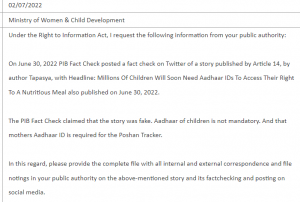 RTI Questions to WCD मीनाक्षी तिवारी 21/01/2023 Share this Facebook Messenger Twitter Pinterest Linkedin Whatsapp Reddit Email Share this Facebook Messenger Twitter Pinterest Linkedin Whatsapp Reddit Email अन्य ख़बरें 07/02/2026 यूपी एसआईआर: चौथी बार बढ़ाई गई समयसीमा, 10 अप्रैल को प्रकाशित होगी अंतिम सूची 07/02/2026 मणिपुर: कुकी उपमुख्यमंत्री, आदिवासी विधायकों को लेकर कुकी-बहुल इलाकों में विरोध-प्रदर्शन जारी 07/02/2026 अदालतें किसी महिला को गर्भावस्था जारी रखने के लिए मजबूर नहीं कर सकतीं: सुप्रीम कोर्ट 07/02/2026 भारत-अमेरिका व्यापार समझौता: भारत ने अमेरिकी सामानों पर टैरिफ में बड़ी कटौती की