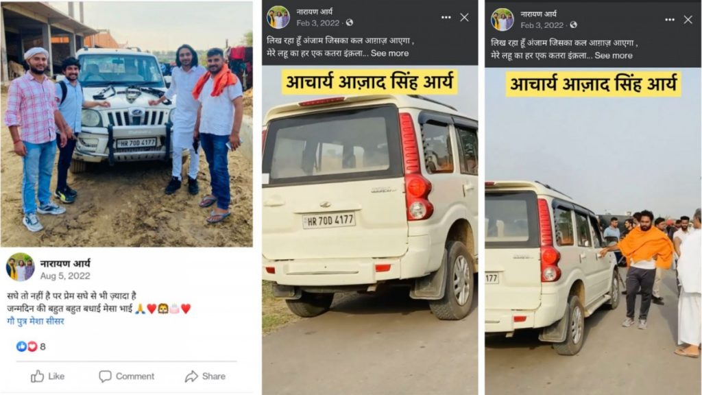 स्कॉर्पियो कार HR 70 D 4177 की तस्वीरें कई गोरक्षकों के सोशल मीडिया अकाउंट पर पोस्ट की गई हैं, जिनमें मोनू मानेसर के साथ कई तस्वीरें भी हैं. उनके सोशल मीडिया एकाउंट हथियारों और घायल पीड़ितों के फुटेज से भरे हुए हैं.