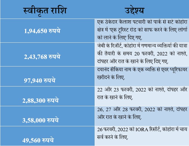 खर्च को सही ठहराने के लिए पार्क अधिकारीयों ने जिस नियम 25 (बी) (2) का हवाला दिया है, उसमें कहा गया है, ‘पर्यटक प्रवेश शुल्क और अन्य शुल्क आदि के माध्यम से प्राप्त धन का 90 प्रतिशत नीचे उल्लिखित गतिविधियों में उपयोग किया जाएगा और फंड का 10 प्रतिशत सोसाइटी फंड के रूप में फिक्स्ड डिपॉज़िट में रखा जाएगा.
