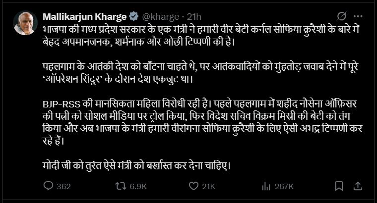 कांग्रेस अध्यक्ष मल्लिकार्जुन खरगे ने एक सोशल मीडिया पोस्ट में कहा कि कर्नल सोफिया कुरैशी को लेकर अपमानजनक टिप्पणी करने वाले विजय शाह को तत्काल बर्खास्त किया दिया जाना चाहिए.