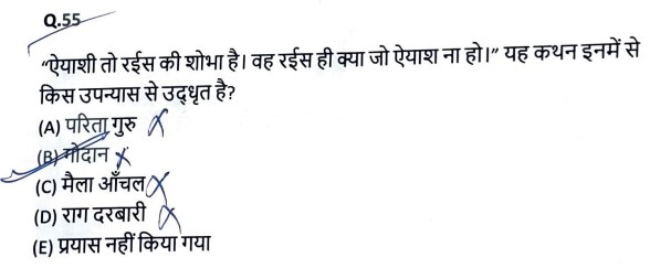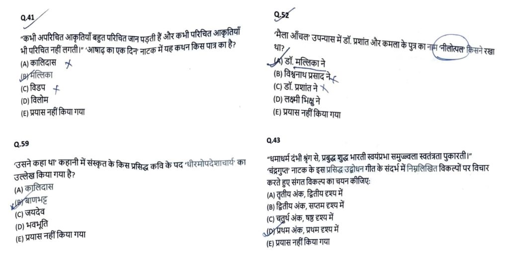 मसलन, इस प्रश्न-पत्र में भारतेंदु हरिश्चंद्र के नाटक ‘भारत-दुर्दशा’ से तीन प्रश्न पूछे गए. पर तीनों प्रश्नों में ‘भारत दुर्दशा’ को ‘भारद्वाजाश्रम’ टाइप किया गया है. ‘परीक्षा गुरु’ उपन्यास को ‘परिता गुरु’ लिखा गया है. ‘आषाढ़ का एक दिन’ से पूछे गए एक प्रश्न के विकल्प में इस नाटक के एक पात्र ‘विद्रुप’ के नाम को ‘विडप’ लिख दिया गया है.