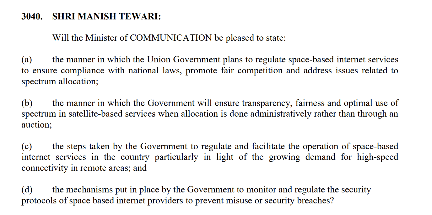 संचार राज्य मंत्री डॉ. पेम्मासनी चंद्रशेखर ने उत्तर दिया था कि इन कंपनियों को भारत में रजिस्टर्ड होना चाहिए और सभी सुरक्षा शर्तें माननी होंगी – जैसे कि सैटेलाइट गेटवे भारत में होना चाहिए, सारा ट्रैफिक वहीं से होकर गुजरे, और सीमाओं पर बफर ज़ोन बनाया जाए.