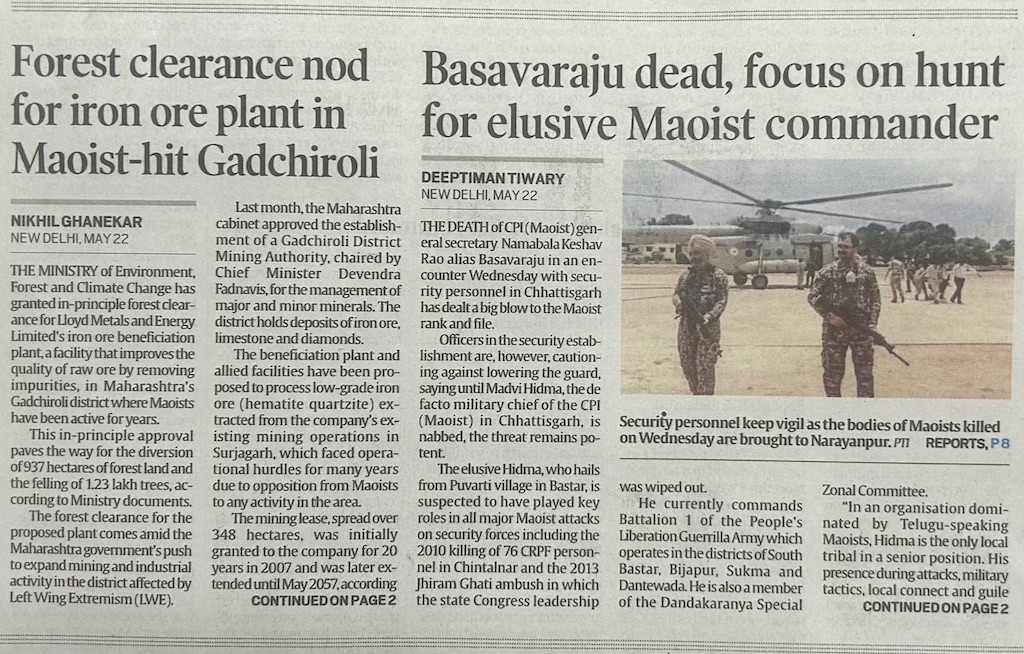 पिछले दिनों एक अख़बार में दो ख़बरें एक साथ प्रकाशित हुई थीं. एक ख़बर माओवादियों के बड़े नेता के मुठभेड़ में मारे जाने की थी. दूसरी, महाराष्ट्र के माओवाद-प्रभावित गढ़चिरौली जिले में लौह अयस्क संयंत्र के लिए फ़ॉरेस्ट क्लीयरेंस मिलने की थी, जिसमें एक लाख 23 हजार पेड़ों का काटा जाना प्रस्तावित था.