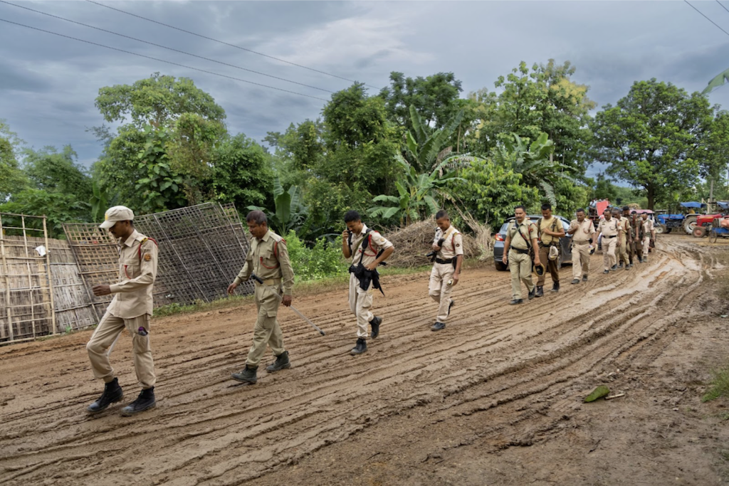 5 जुलाई को असम के धुबरी में प्रस्तावित थर्मल पावर प्लांट स्थल पर पुलिस गश्त करती हुई. (फोटो: काज़ी शरोवर हुसैन)