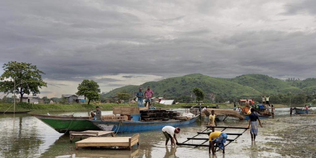 कहीं और जाने की जगह न होने के कारण, कई बेदखल परिवारों ने ब्रह्मपुत्र नदी के तटीय क्षेत्रों में अपने रिश्तेदारों के पास अस्थायी रूप से बसने का फैसला किया है. लोग अपने टूटे हुए घरों को नावों पर ले जा रहे हैं. (फोटो: काज़ी शरोवर हुसैन)