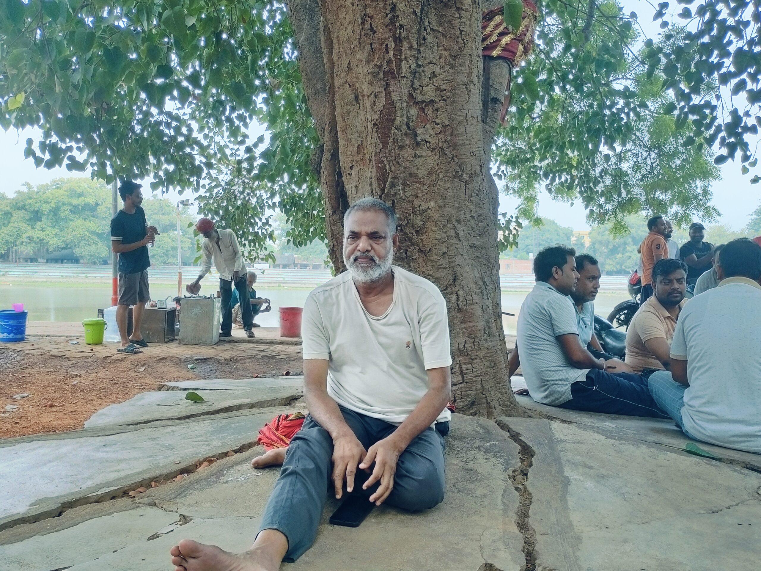 जेपी सेनानी और वरिष्ठ रंगकर्मी 62 वर्षीय अशोक मानव कलक्टरी तालाब किनारे पीपल वृक्ष के नीचे चबूतरे पर बैठे हुए.