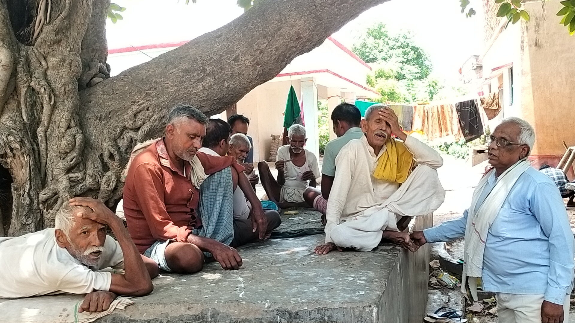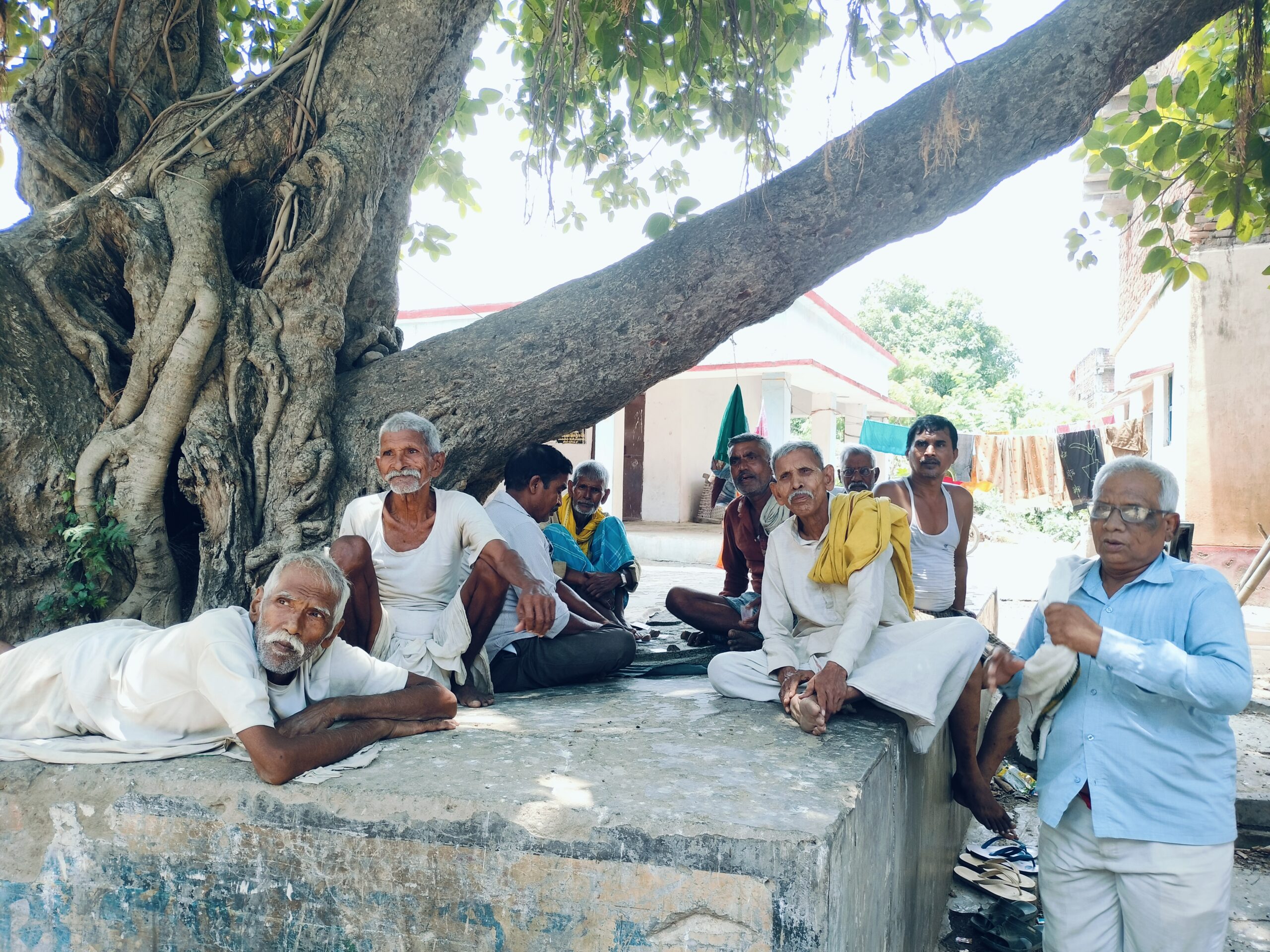 भोजपुर जिला मुख्यालय से हरिगांव कचहरी स्थित पीपल के पेड़ के नीचे बैठे गांव के लोग पीले रंग कंधे गमछी लिए 65 वर्षीय ईश्वर दयाल चौरसिया और उनके साथी. (सभी फोटो: अशुतोष पांडेय)