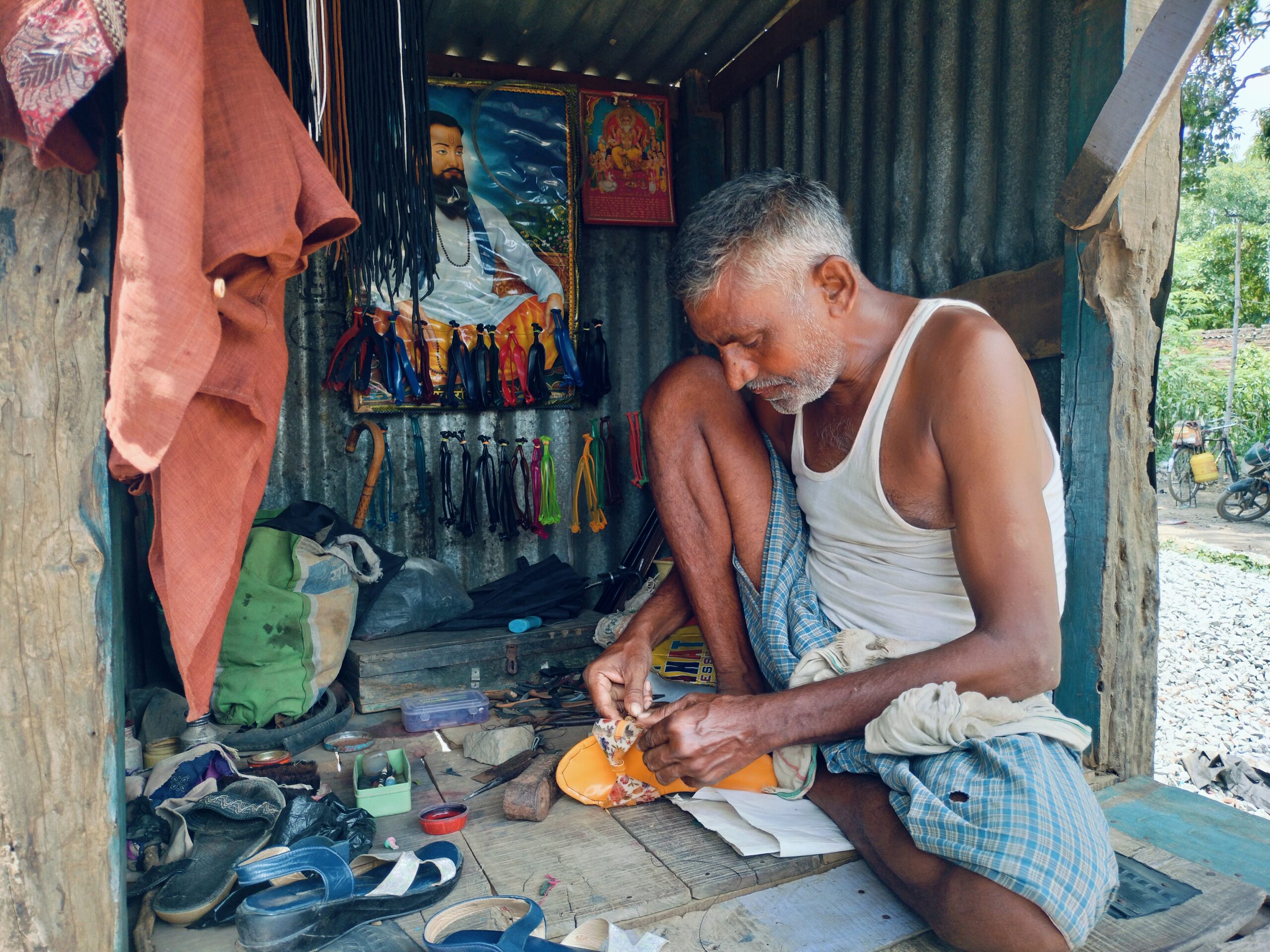 55 वर्षीय रमेश राम अपने दुकान पर मोची का काम करते हुए.