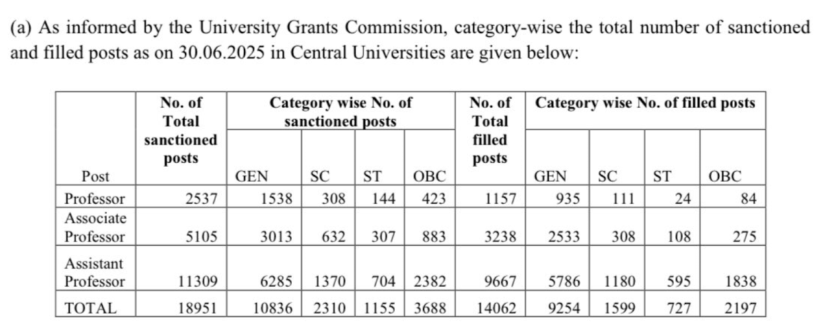 30 जून, 2025 तक केंद्रीय विश्वविद्यालयों में सभी श्रेणियों में प्रोफेसर, एसोसिएट प्रोफेसर और असिस्टेंट प्रोफेसर के लिए स्वीकृत पदों की कुल संख्या 18,951 थी. इनमें से 14,062 पद भरे जा चुके हैं, जिससे 25% पद रिक्त रह गए हैं. सामान्य श्रेणी में केवल 15% सीटें खाली रह गई हैं, जबकि आरक्षित श्रेणियों में रिक्तियों की दर सबसे ज़्यादा है.