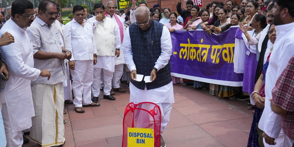 राज्यसभा में विपक्ष के नेता और कांग्रेस सांसद मल्लिकार्जुन खरगे ने एसआईआर लिखा एक प्लेकार्ड फाड़कर कूड़ेदान में फेंकते हुए. (फोटो: पीटीआई)