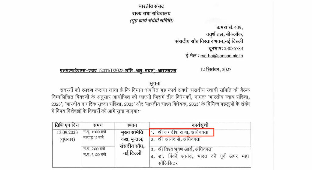साल 2023 में जब ‘भारतीय न्याय संहिता, 2023’; ‘भारतीय नागरिक सुरक्षा संहिता, 2023’ और ‘भारतीय साक्ष्य विधेयक, 2023’ के विभिन्न पहलुओं पर संसद की एक स्थायी समिति में चर्चा चल रही थी, तब सरकार ने जगदीश राणा को बतौर विशेषज्ञ आमंत्रित किया था.