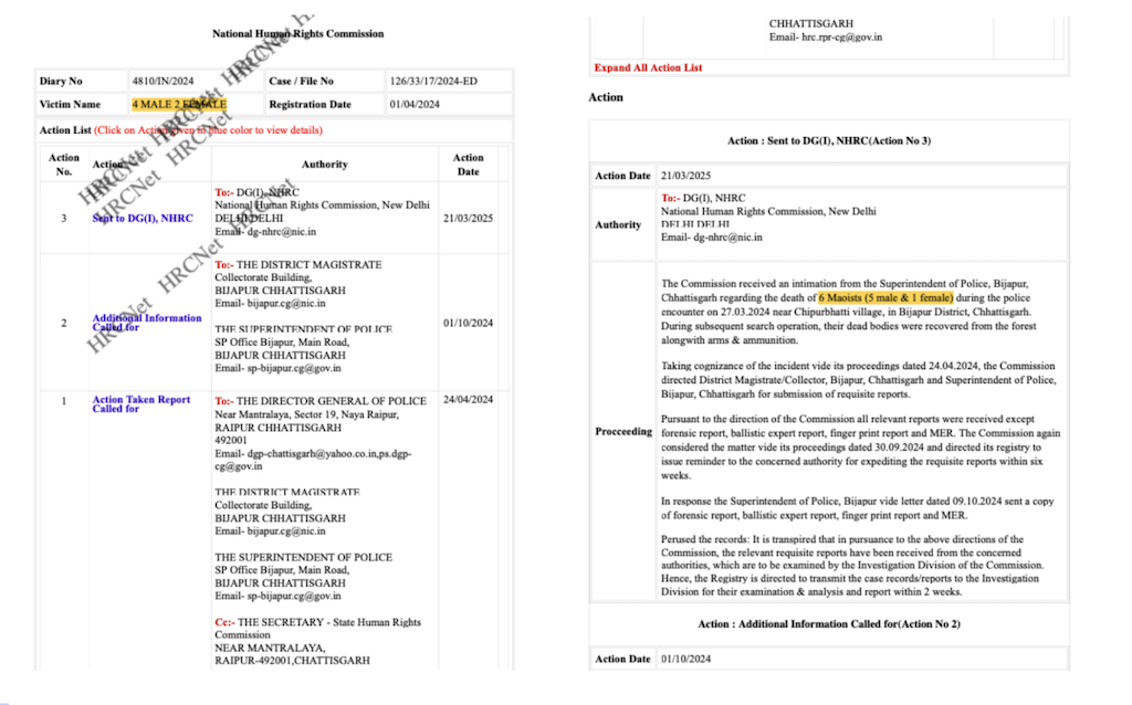 12 मई, 2024 को हुई एक घटना में ग्रामीणों ने कहा कि मारे गए 12 कथित माओवादियों में से दस असल में आम नागरिक थे. फिर भी संयुक्त राष्ट्र (यूएन) के सिद्धांतों के अनुसार स्थापित देश की सर्वोच्च मानवाधिकार संस्था, एनएचआरसी ने चुप्पी साधे रखी. उसे एक ही घटना में इतनी बड़ी संख्या में हुई मौतों की स्वतः संज्ञान लेकर फैक्ट-फाइडिंग या जांच की कोई ज़रूरत नहीं दिखी.