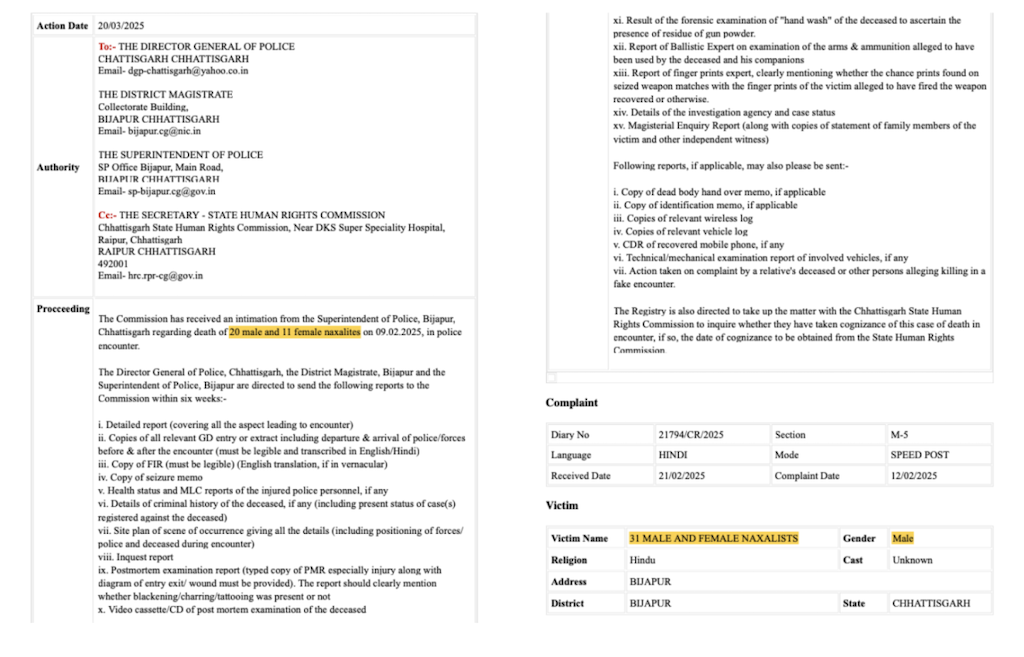 जून और जुलाई में मैंने जनवरी 2024 से दर्ज की गई राष्ट्रीय मानवाधिकार आयोग (एनएचआरसी) की शिकायतों को पढ़ा, जो बस्तर संभाग के सात जिलों- बस्तर, बीजापुर, दंतेवाड़ा, कांकेर, कोंडागांव, नारायणपुर और सुकमा – पर केंद्रित थीं.