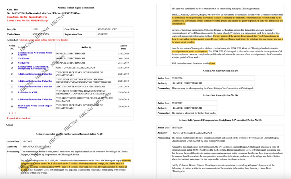राष्ट्रीय मानवाधिकार आयोग ने 2019 में बीजापुर के एक अक्टूबर 2015 के मामले में मुआवज़े का आदेश दिया था. यह मामला पांच गांवों में पुलिस और सुरक्षा बलों द्वारा आदिवासी महिलाओं के साथ बलात्कार, सामूहिक बलात्कार और हमलों की एक श्रृंखला से जुड़ा था. अदालत ने फरवरी 2020 में इस मामले में अपना अंतिम आदेश सुनाया, जिसमें उसने कहा कि महिलाओं ने पैसे लेने से इनकार कर दिया है क्योंकि अपराधियों को सज़ा नहीं मिली है.