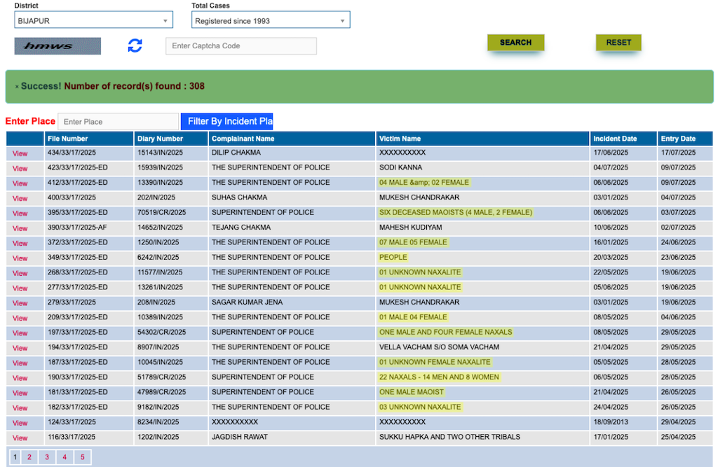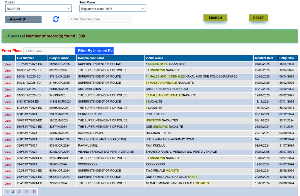 बीजापुर ज़िले से कुछ शिकायतें, जहां इस साल अप्रैल में कर्रेगुट्टा ऑपरेशन हुआ था, नीचे दी गई हैं. परिणामों का पहला पृष्ठ अस्पष्ट प्रविष्टियों से भरा था, जिनमें ‘अज्ञात’ व्यक्ति जैसे शब्द और संख्यात्मक प्लेसहोल्डर दोहराए गए थे. (चित्र 1)