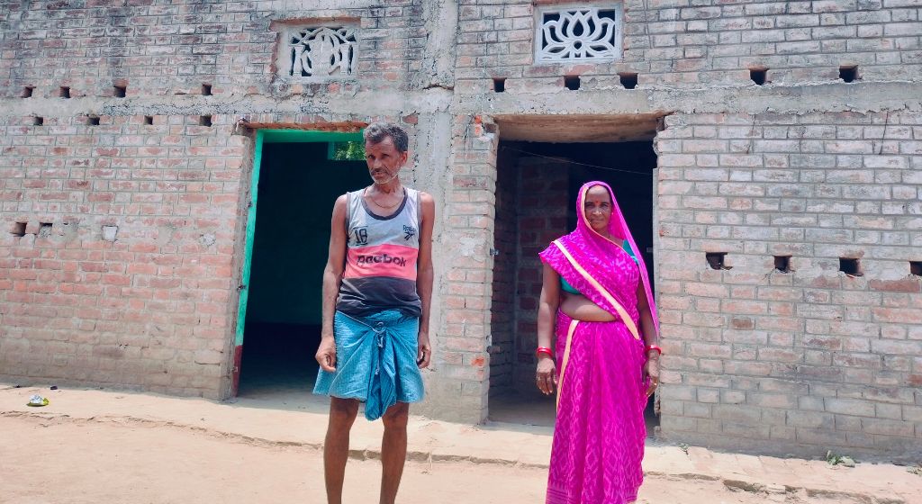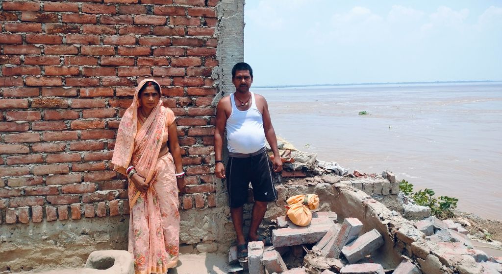 38 वर्षीय संतोष शाह अपनी पत्नी निशु देवी के साथ चार कमरों का घर दिखाते हैं, जिसका आधा हिस्सा गंगा नदी में चला गया है.