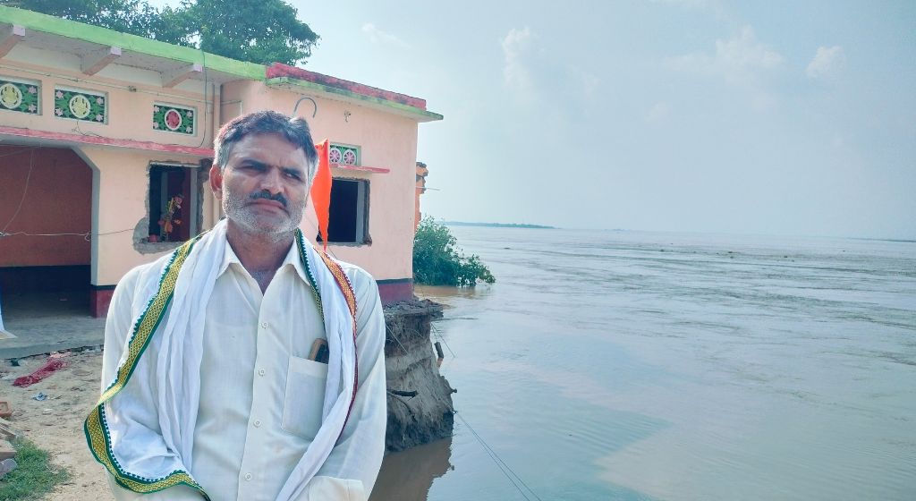 बेतरतीब बाल, आसमानी रंग का लुंगी और रंगीन गंजी पहने 55 वर्षीय ईश्वर दयाल यादव के चेहरे पर हताशा साफ नजर आ रही है. उनका यह घर गंगा के तेज कटाव से पानी में समाने जा रहा है.