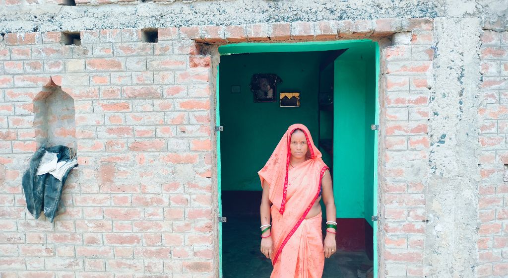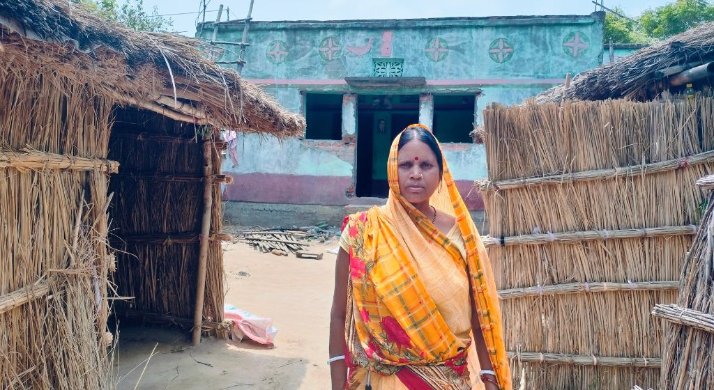 घर के बाहर 50 वर्षीय हीरामणि देवी अपने दुआर पर खड़ी हैं.