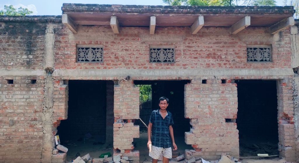 थोड़ी दूर पर 21 वर्षीय रामेश्वर कुमार यादव का चार कमरों का घर खाली हो चुका है. खिड़की और दरवाजे निकाले जा चुके हैं. मिट्टी का चूल्हा आंगन में पड़ा है. घर वीरान है, मरघटी सन्नाटा छाया हुआ है.