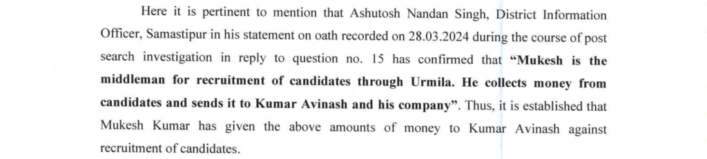 इसकी पुष्टि समस्तीपुर के तत्कालीन जिला सूचना अधिकारी आशुतोष नंदन सिंह के विभाग को दिए बयान से भी होती है. आयकर विभाग के अनुसार उन्होंने इसकी पुष्टि की है कि कुमार अनिवाश ने प्रत्याशियों की पैसे लेकर भर्ती करवाई है.