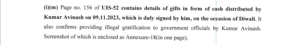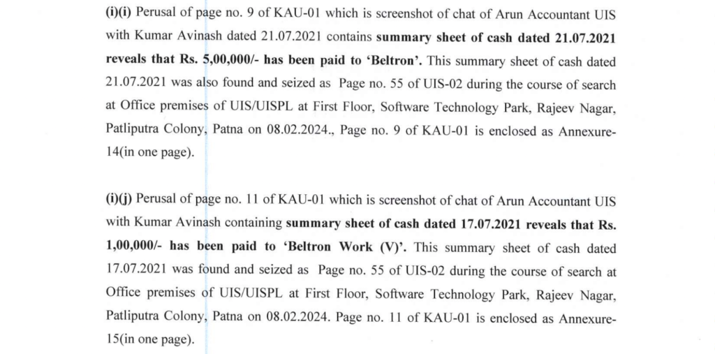 आयकर निदेशक के पत्र में कुमार अविनाश के साथ विभिन्न लोगों के साथ वॉट्सऐप चैट संलग्न हैं. रंजन कुमार ने एक जब्त हुई डायरी का भी जिक्र किया है, जिसमें ढेर सारा लेन-देन दर्ज है और जिस पर कुमार अविनाश के हस्ताक्षर हैं.