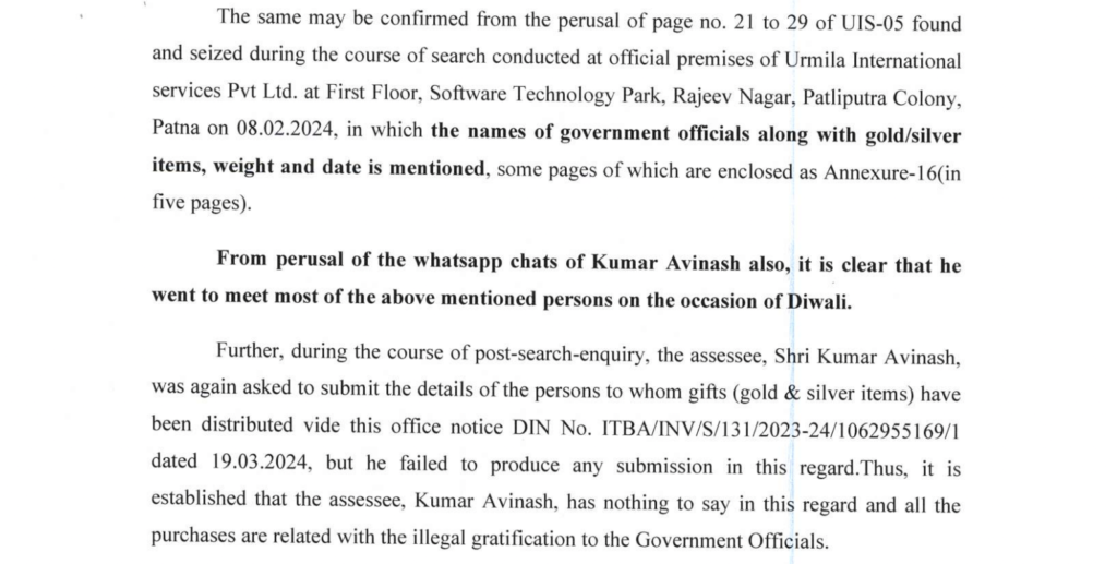 मुख्य सचिव को लिखे पत्र में आयकर विभाग ने कहा कि ‘जांच के दौरान यह भी पाया गया कि कुमार अविनाश सरकारी कार्यालयों/अधिकारियों को सोने-चांदी के सिक्के/आभूषण देकर अवैध रूप से लाभ पहुंचाने में संलिप्त हैं. इसकी पुष्टि कुमार अविनाश द्वारा उनके नाम पर उनकी कंपनी के नाम पर और अन्य व्यक्तियों के नाम पर की गई खरीदारी के विवरण से होती है.’