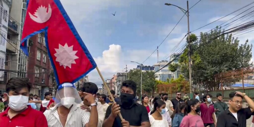 काठमांडू, नेपाल में भ्रष्टाचार और सरकार द्वारा सोशल मीडिया साइटों पर प्रतिबंध लगाने के फ़ैसले के खिलाफ हुए प्रदर्शन के दौरान राष्ट्रीय ध्वज लहराते युवा प्रदर्शनकारी. (फोटो: पीटीआई.)