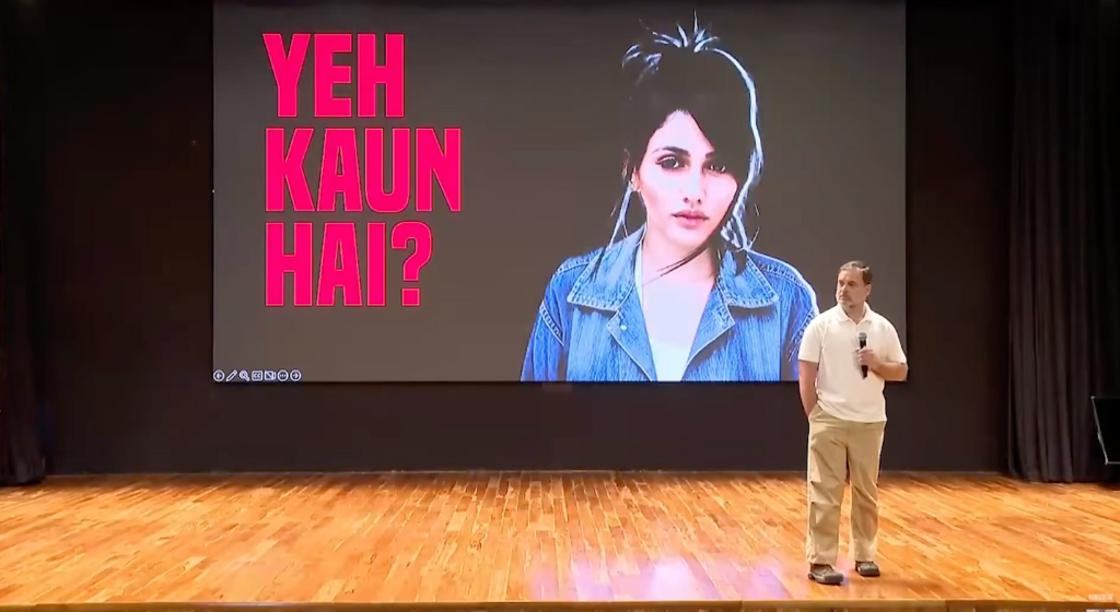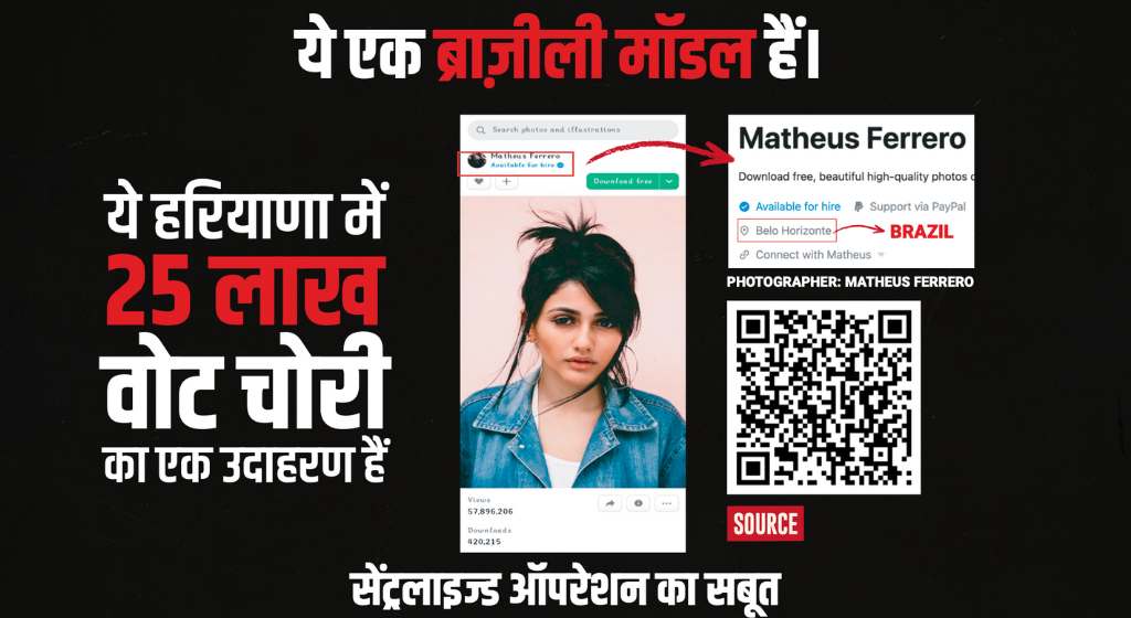 कांग्रेस नेता ने अपने आरोप को साबित करने के लिए एक ब्राज़ीलियाई मॉडल की तस्वीर दिखाई. उन्होंने दावा किया कि इस मॉडल की तस्वीर हरियाणा के कई मतदान केंद्रों पर 22 बार अलग-अलग नामों से इस्तेमाल की गई – जैसे सीमा, स्वीटी और सरस्वती.