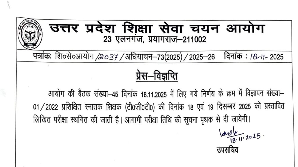 आयोग द्वारा जारी आधिकारिक नोटिस में कहा गया है, ‘आयोग की बैठक में लिए गए निर्णय के अनुसार यूपी टीजीटी विज्ञापन संख्या 01/2022 की लिखित परीक्षा, जो 18 और 19 दिसंबर 2025 को होनी थी, अब स्थगित कर दी गई है.’