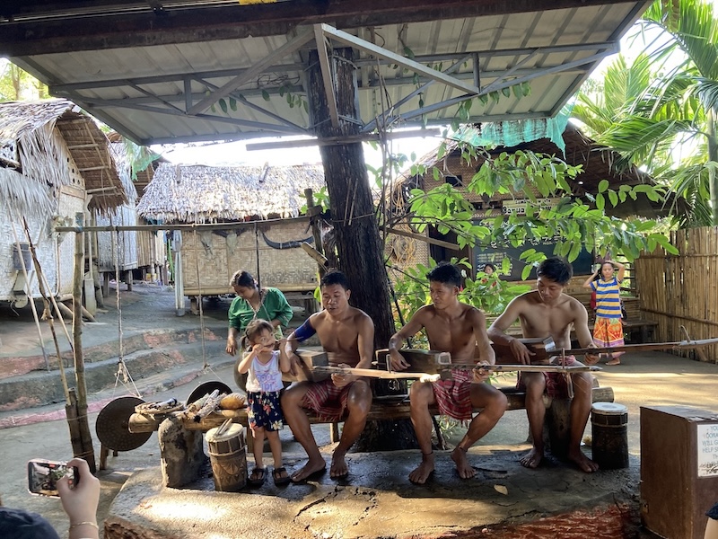 एक आदमी इंग्लिश में विदेशी पर्यटकों को उनके इतिहास, रहन-सहन, तौर-तरीकों के बारे में बता रहा था. उनके साथ आदिवासी वेषभूषा धारी पुरुष और महिलाएं पारंपरिक गतिविधियां दिखा रहे थे. जैसे जब वह उनके शिकार के बारे में बताता वे पारंपारिक भाले, तीर-धनुष से शिकार करने का एक्टिंग करते. जब उनके संपर्क सिस्टम के बारे में बताते तो वे अलग-अलग जानवरों, पक्षियों की आवाजें निकालते. जब आग जलाने के बारे में बताते वे चकमक पत्थरों और बांस की खपच्चियों को घिसकर आग जलाते. जब उनके नाच-गाने के बारे में बताते उसकी एक्टिंग करते. तरह-तरह के बांस और लकड़ी से बने वाद्ययंत्र बजाकर दिखाते. आखिर में विदेशी पर्यटक प्रदर्शनी के लिए बने घरों के सामने उनके साथ फोटो खिंचवाते, जैसे वे कोई इंसान नहीं, जंगली अजूबे हों.