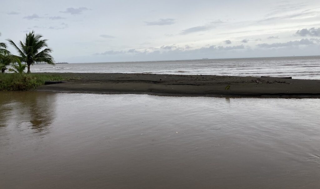 पलावन का समुद्र तट जहां खदान का पानी आकर मिलता है, मटमैला हो गया है. (फोटो: संतोषी मरकाम)