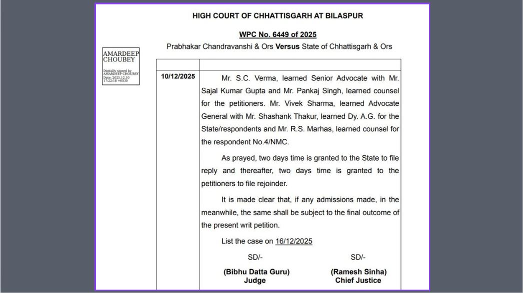 इस संबंध में छत्तीसगढ़ हाईकोर्ट ने बुधवार (10 दिसंबर) को सुनवाई करते हुए राज्य सरकार को नोटिस जारी कर दो दिनों के भीतर जवाब पेश करने के निर्देश दिए हैं. इस मामले की अगली सुनवाई के लिए अदालत ने 16 दिसंबर की तारीख निर्धारित की है.