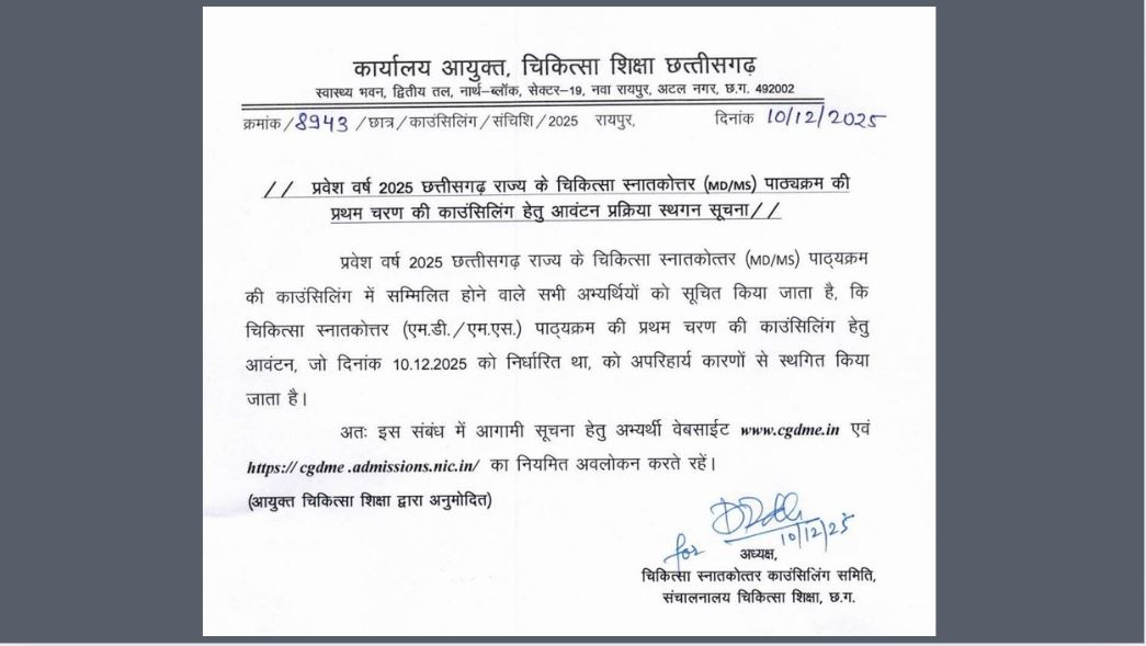 मालूम हो कि छत्तीसगढ़ सरकार ने हाल ही में गजट नोटिफिकेशन जारी कर मेडिकल स्नातकोत्तर (पीजी) प्रवेश नियम 2025 में आंशिक संशोधन कर राज्य कोटे की सीटें 50% से घटाकर 25% कर दी हैं. नए नियम के लागू के बाद अब राज्य के मेडिकल कॉलेजों में 75 प्रतिशत एडमिशन केवल मेरिट यानी नीट पीजी रैंकिंग के आधार पर ही होगा और इंस्टिट्यूशनल प्रेफरेंस यानी आपने किस कॉलेज से एमबीबीएस किया है, ये कोई मायने नहीं रखता है.