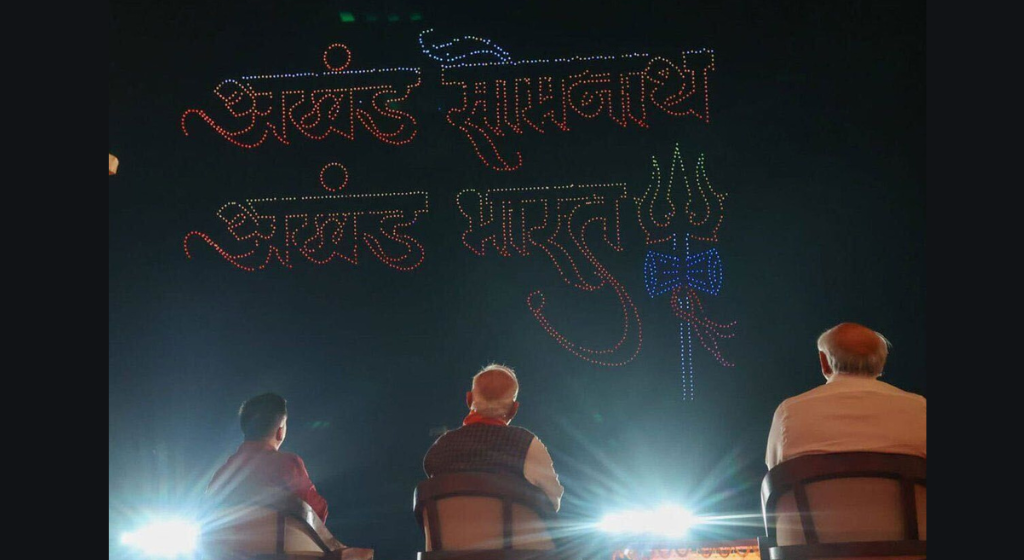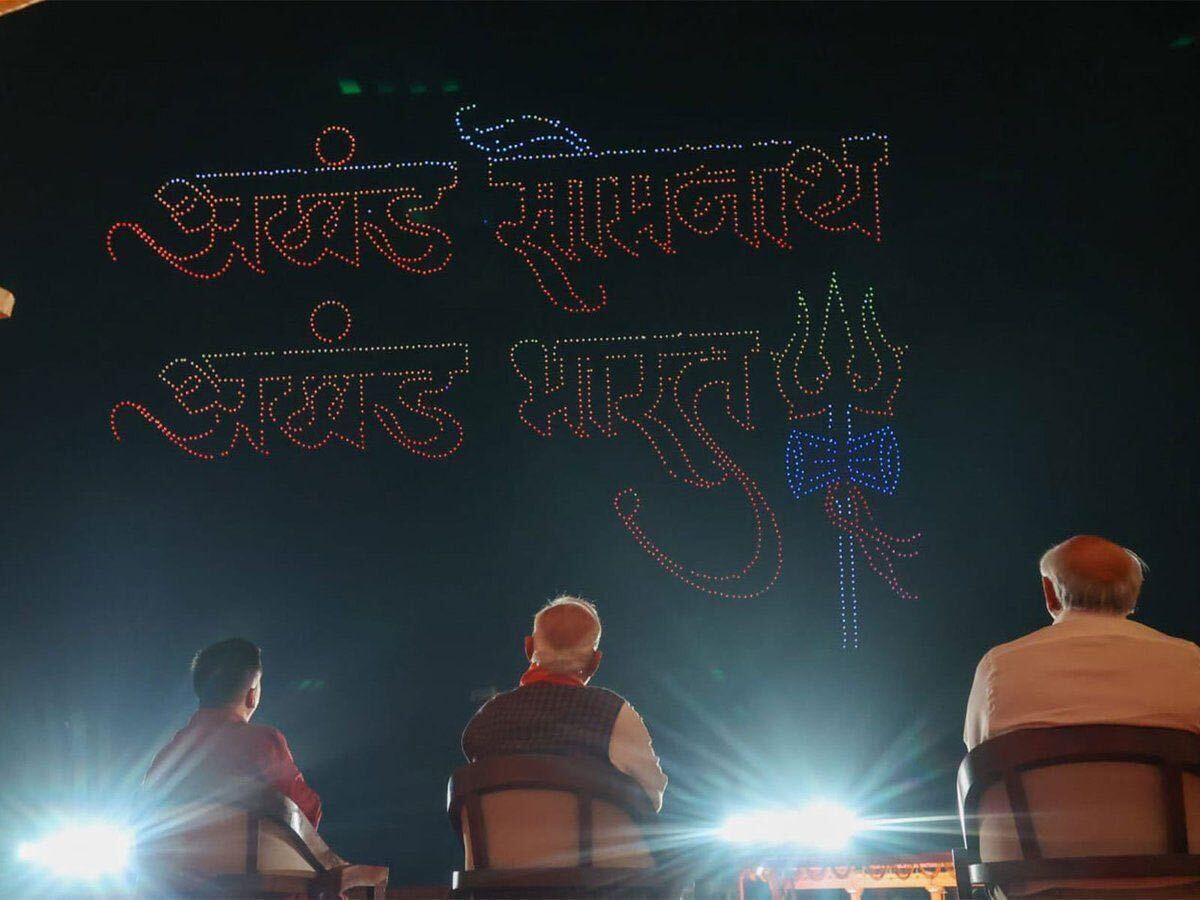 मंदिर की ओर जाने वाली सड़क पर ‘त्रिशूल’, ‘ॐ’ और ‘डमरू’ की आकृतियों वाली लाइटें, फूलों से बने शिवलिंग, और बड़े-बड़े बैनरों पर लिखे नारे-‘अखंड सोमनाथ, अखंड भारत’ लगाए गए थे. प्रधानमंत्री की मौजूदगी में हुए ड्रोन शो में भी त्रिशूल के साथ यही आकृति (अखंड सोमनाथ, अखंड भारत) उकेरी गई.