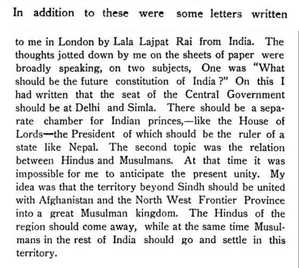 बाद के वर्षों में हिंदू महासभा से जुड़े आर्य समाज के वरिष्ठ पदाधिकारी भाई परमानंद ने अपनी आत्मकथा में लिखा है कि 1905 में वह और लाला लाजपत राय पत्र के जरिए भारत के भविष्य पर चर्चा कर रहे थे. लाला लाजपत राय को लिखे पत्र में भाई परमानंद का विचार था, ‘उस समय मेरे लिए वर्तमान एकता (हिंदू-मुस्लिम) की कल्पना करना असंभव था. मेरा विचार यह था कि सिंध से आगे का इलाक़ा अफ़ग़ानिस्तान और उत्तर-पश्चिम सीमांत प्रांत के साथ मिलकर एक बड़े मुस्लिम राज्य में शामिल किया जाए. इस क्षेत्र के हिंदुओं को वहां से हट जाना चाहिए, जबकि भारत के शेष हिस्सों में रहने वाले मुसलमानों को इस क्षेत्र में जाकर बस जाना चाहिए.’