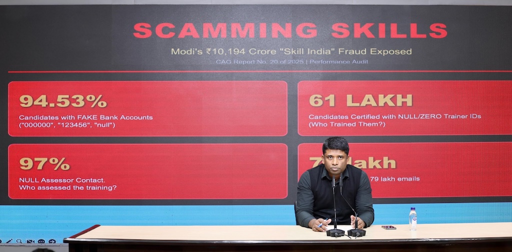 कन्नन गोपीनाथन ने एक्स पर एक पोस्ट में कहा, ‘यह सरकार की अभूतपूर्व ‘स्कैमिंग स्किल्स’ को उजागर करता है. हमने 2015 से 2022 के दौरान स्किल इंडिया मिशन में हुए बड़े पैमाने के घोटाले को लेकर कैग रिपोर्ट पर प्रेस ब्रीफिंग की है. इस 10,000 करोड़ रुपये के घोटाले की कैग रिपोर्ट में 95 प्रतिशत फर्जी बैंक खाते, 96 प्रतिशत फर्जी मोबाइल नंबर और 97 प्रतिशत फर्जी असेसर विवरण सामने आए हैं. आपका वह टैक्स का पैसा, जो आपके हाथ में आने से पहले ही कट जाता है, कौशल विकास के नाम पर लूट लिया गया है.