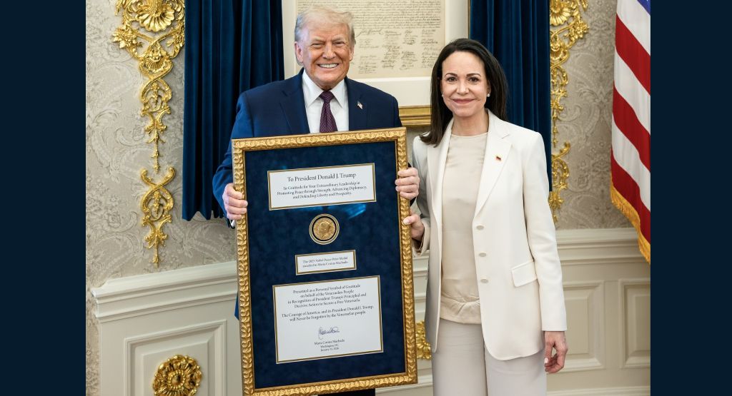 इसके बाद ह्वाइट हाउस ने ओवल ऑफिस की एक तस्वीर साझा की, जिसमें मचादो ट्रंप के साथ खड़ी हैं और ट्रंप एक बड़े फ्रेम में क़ैद पदक थामे हुए हैं. फ्रेम में लिखा है, ‘एक स्वतंत्र वेनेजुएला सुनिश्चित किए जाने को लेकर राष्ट्रपति ट्रंप के सिद्धांतनिष्ठ और निर्णायक कदमों की मान्यता में वेनेजुएला की जनता की ओर से व्यक्तिगत कृतज्ञता के प्रतीक के रूप में प्रस्तुत.’