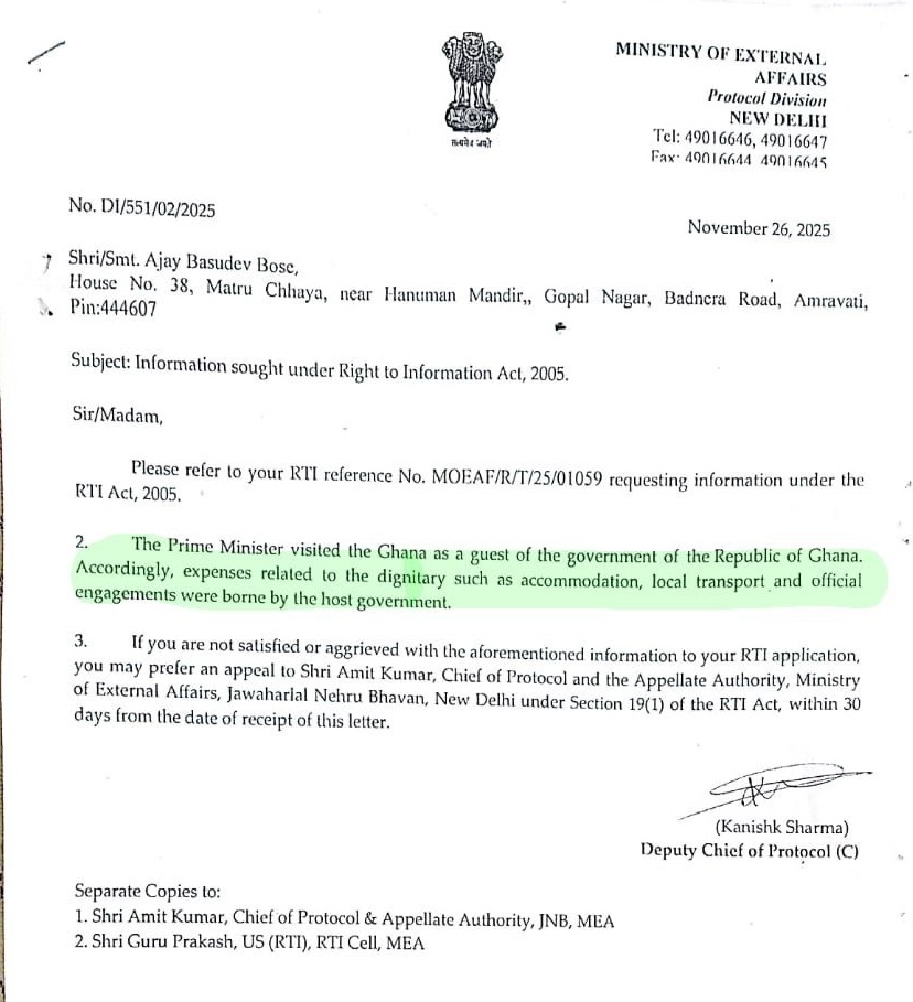 26 नवंबर, 2025 को विदेश मंत्रालय के प्रोटोकॉल डिवीजन की ओर से दिए गए आरटीआई जवाब में कहा गया था कि प्रधानमंत्री ने घाना की यात्रा वहां की सरकार के अतिथि के रूप में की थी और उनके आवास, स्थानीय परिवहन और आधिकारिक कार्यक्रमों से जुड़ा खर्च मेज़बान देश ने उठाया.
